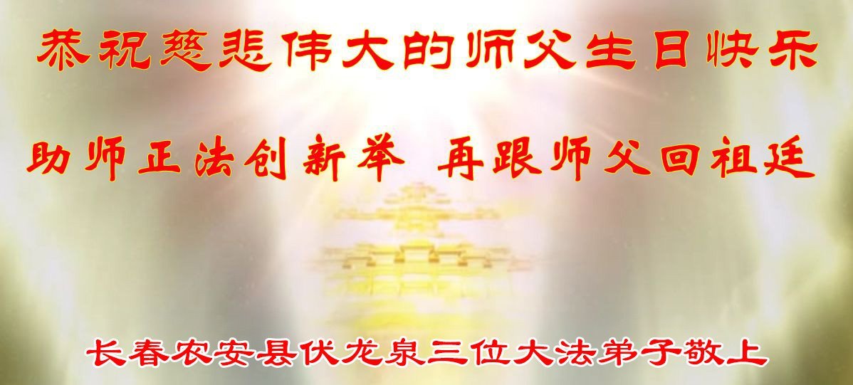 恭祝慈悲伟大的师父生日快乐!恭贺世界法轮大法日! 吉林省长春市公主岭夫妻大法弟子敬上 吉林省长春农安县三位大法弟子恭祝慈悲伟大的师父生日快乐!恭贺世界法轮大法日!