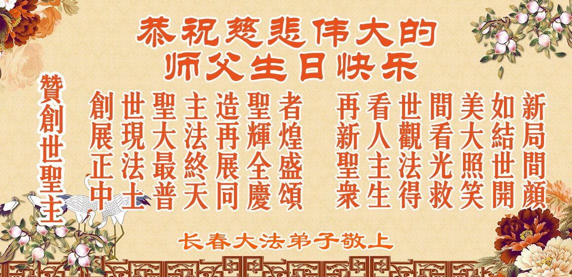 恭祝慈悲伟大的师父华诞暨世界法轮大法日! 吉林省长春市净月区大法弟子敬上 吉林省长春大法弟子恭祝慈悲伟大的师父生日快乐!恭贺世界法轮大法日!