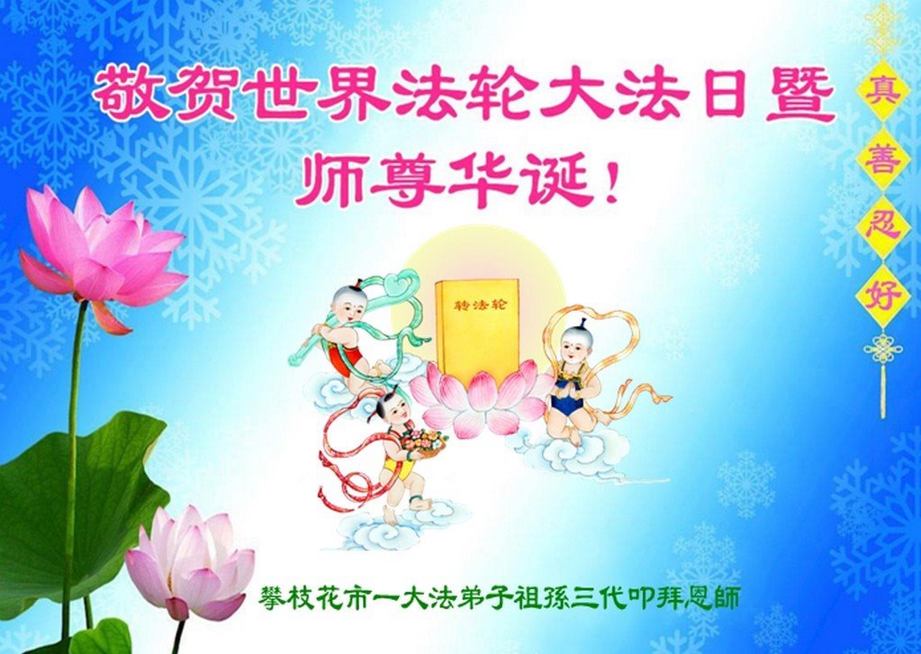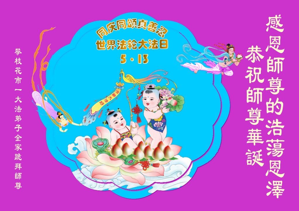 普天同庆同颂世界法轮大法日! 恭祝师尊华诞!感恩师尊的浩荡恩泽! 四川攀枝花市一大法弟子全家跪拜 四川攀枝花市西区全体大法弟子恭贺世界法轮大法日!
