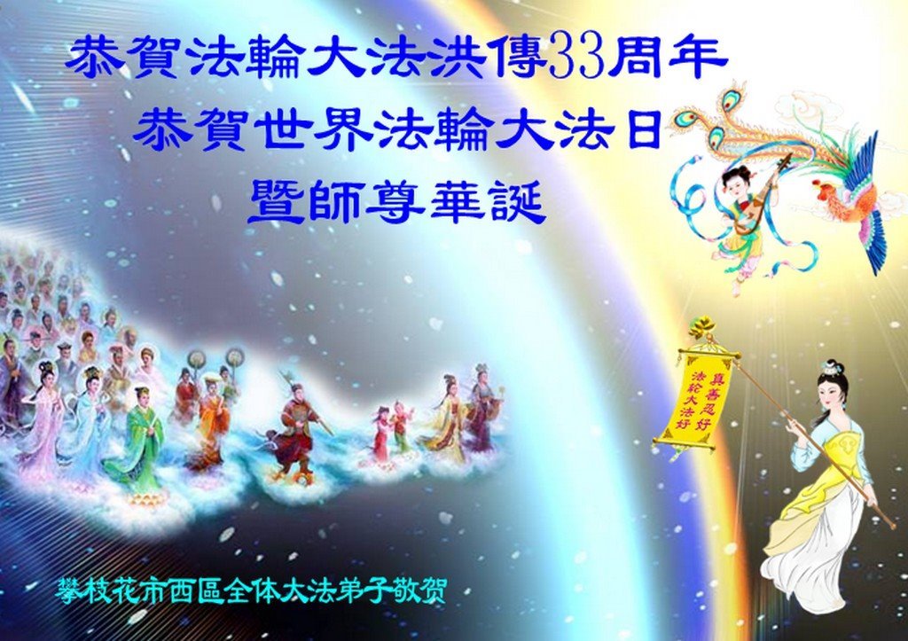 恭贺513世界法轮大法日! 恭贺法轮大法洪传33周年! 恭祝师尊华诞!感恩师尊佛恩浩荡! 四川攀枝花市大法弟子叩拜 四川省广安市一县城大法弟子恭贺世界法轮大法日暨师父生日快乐!
