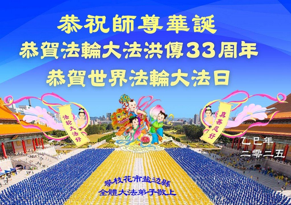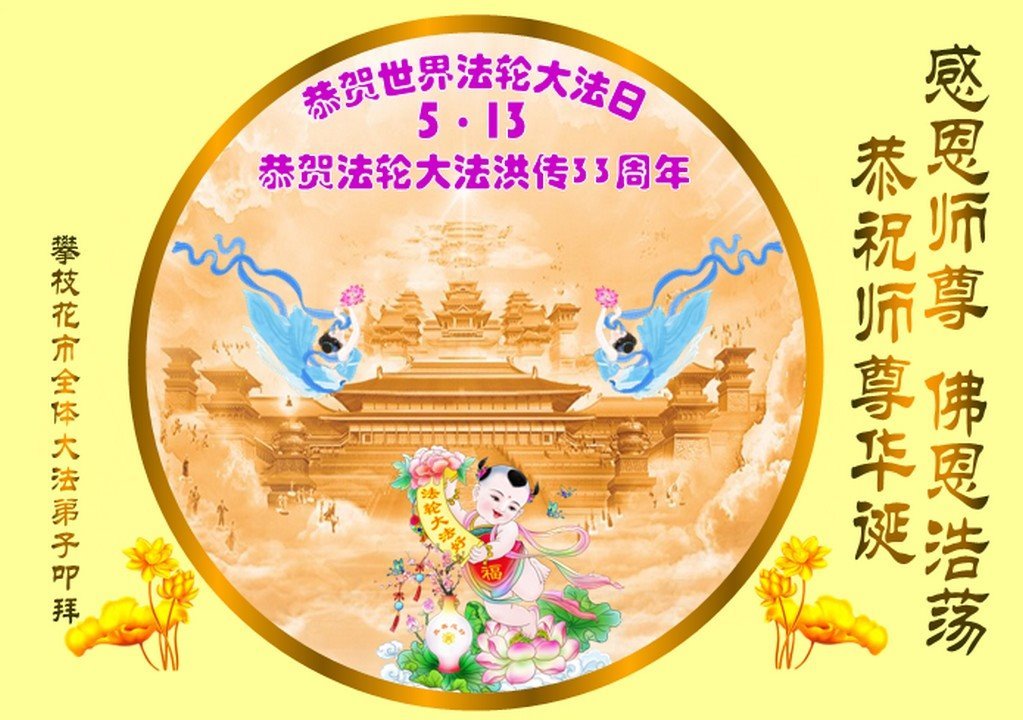恭祝师尊华诞! 恭贺法轮大法洪传33周年! 恭贺世界法轮大法日! 四川攀枝花市盐边县大法弟子敬上 四川攀枝花市仁和区全体大法弟子同庆世界法轮大法日!