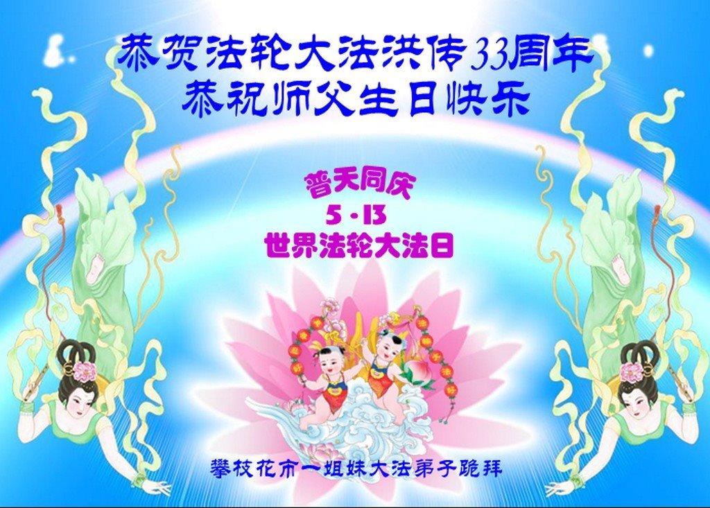 恭贺法轮大法洪传33周年! 普天同庆513世界法轮大法日! 恭祝师父生日快乐! 四川攀枝花市一姐妹大法弟子跪拜 四川攀枝花市大法弟子恭贺世界法轮大法日暨师尊生日快乐!
