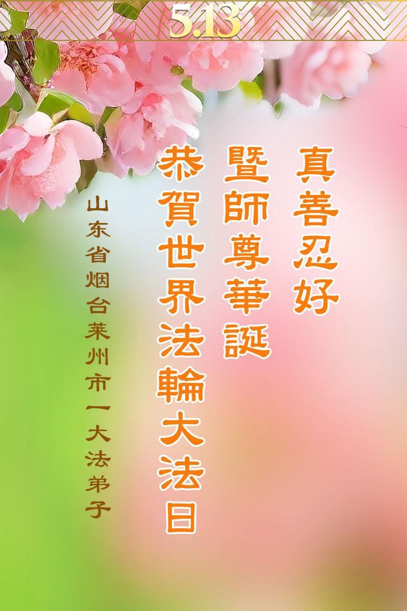 山东省烟台市莱州市一家大法弟子恭贺世界法轮大法日!恭祝慈悲伟大的师尊生日快乐!