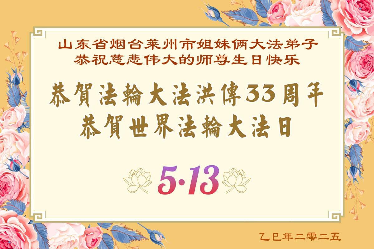 山东省烟台莱州市姐妹俩大法弟子恭贺世界法轮大法日!恭祝慈悲伟大的师尊生日快乐!