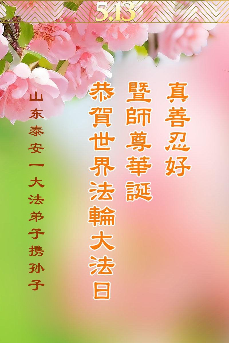 恭贺法轮大法洪传33周年!共庆世界法轮大法日!恭祝师尊华诞! 山东省保险业大法弟子敬上 山东省泰安一大法弟子携孙子恭贺世界法轮大法日暨师尊华诞!