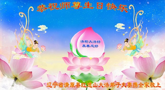 辽宁省抚顺市清原县红透山大法弟子夫妻携全家恭贺世界法轮大法日暨敬祝师尊华诞!