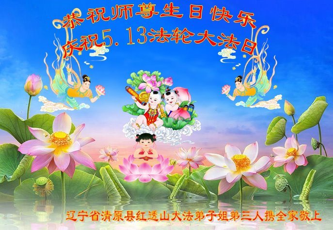 辽宁省抚顺市清原县红透山大法弟子姐弟三人携全家恭贺世界法轮大法日暨敬祝师尊华诞!