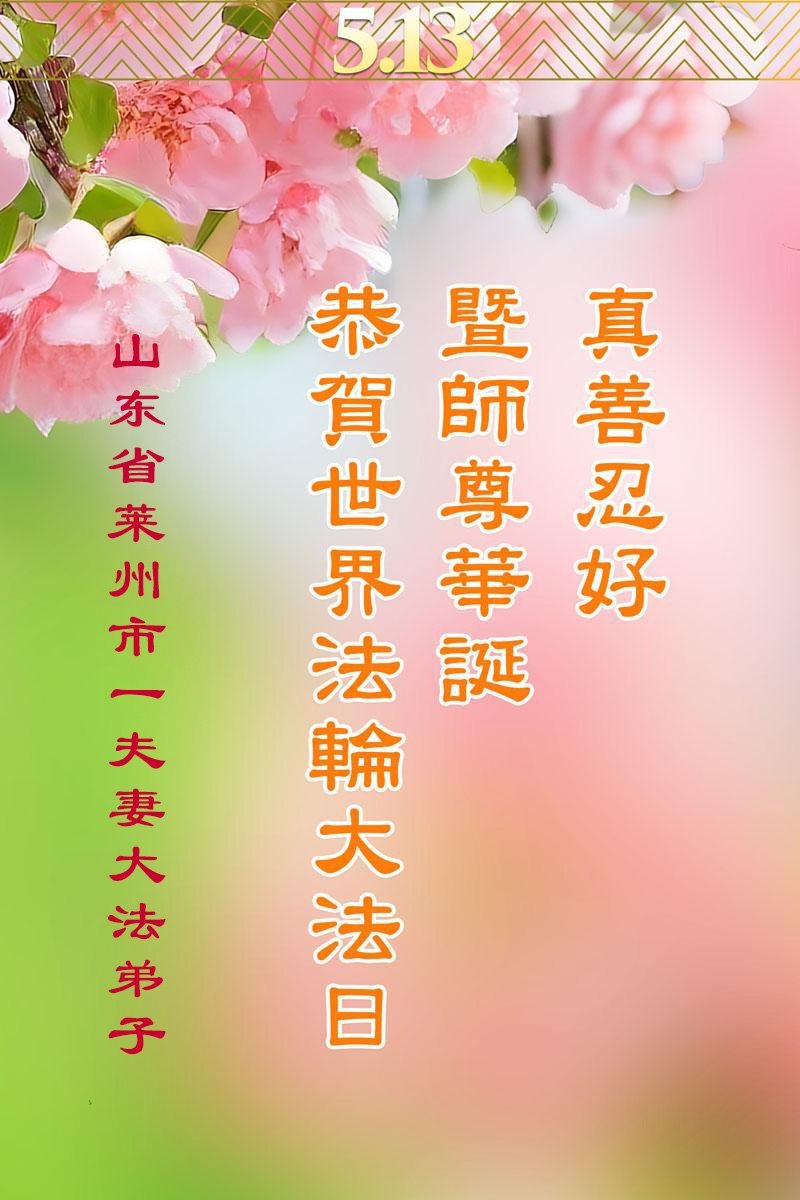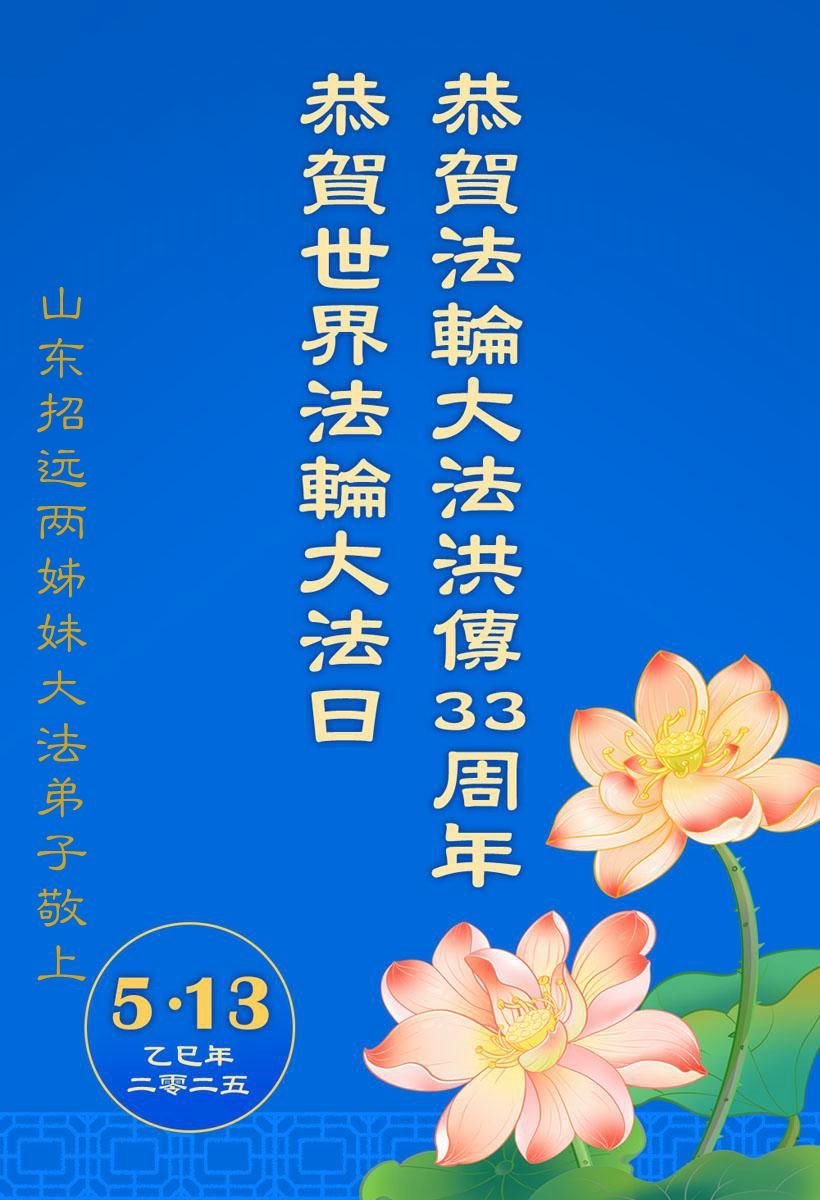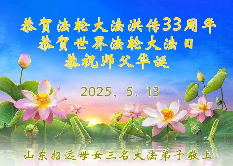 恭贺法轮大法洪传三十三周年!恭贺世界法轮大法日!恭祝师父华诞! 适逢5.13之际,我姊妹俩感恩师父的慈悲看护和点悟,让弟子们在大法的修炼中,走过了风风雨雨的二十八年。在今后的日子里,弟子们唯有精進实修,去掉常人中的各种执著,助师正法,救度众生,跟上正法進程,跟师父回家。弟子叩拜师父! 山东招远两姊妹大法弟子敬上 2025年4月23日 山东省烟台市莱州市一夫妻大法弟子恭贺世界法轮大法日暨师尊华诞!
