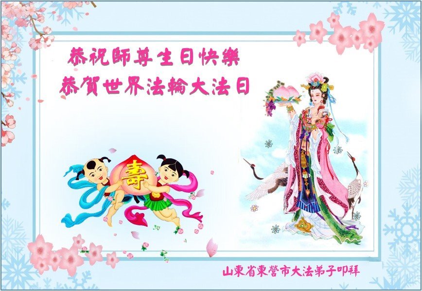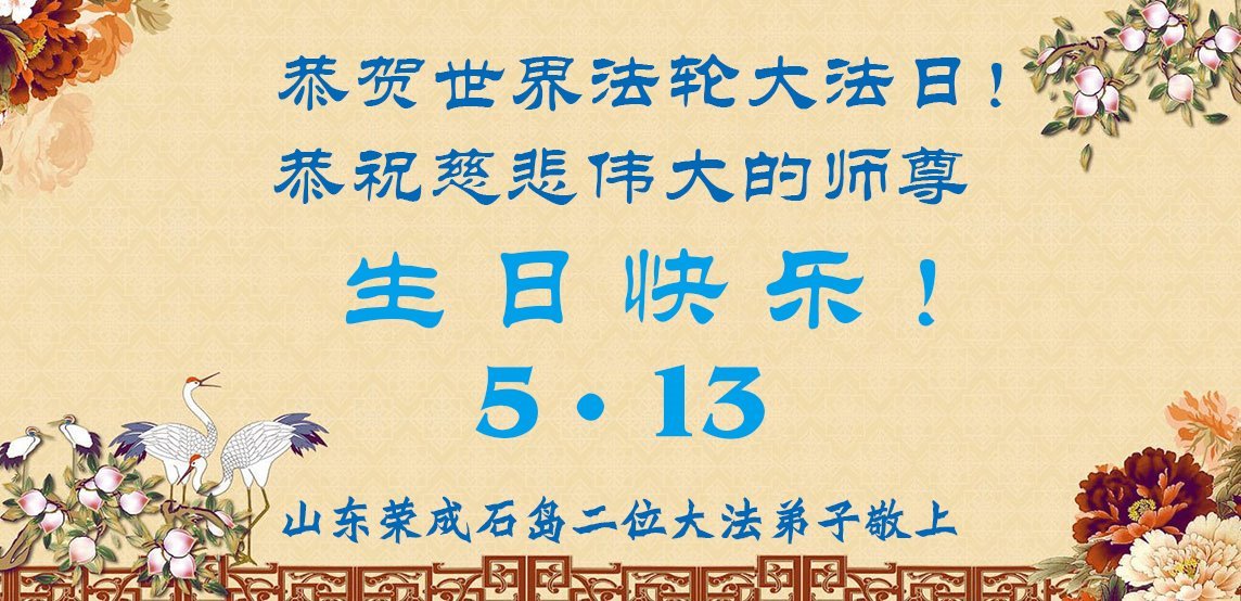 恭祝慈悲伟大的师尊生日快乐! 恭贺世界法轮大法日! 恭贺法轮大法洪传33周年! 山东省东营市大法弟子敬上 山东省烟台招远市俩大法弟子恭贺世界法轮大法日暨师尊生日快乐!