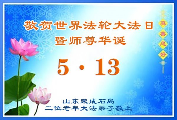 恭贺5.13世界法轮大法日!恭祝慈悲伟大的师尊生日快乐! 山东省荣成市石岛二位大法弟子敬上 山东省威海市荣成市石岛二位老年大法弟子敬贺世界法轮大法日暨师尊华诞!