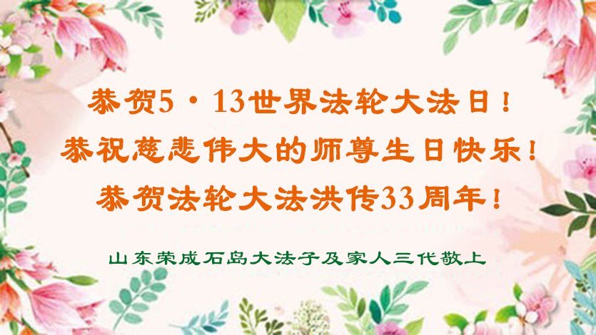 恭贺5.13世界法轮大法日! 恭祝慈悲伟大的师尊生日快乐!恭贺法轮大法洪传33周年! 山东省荣成市石岛大法弟子及家人三代敬上 山东省烟台市招远市一学法小组五位大法弟子恭贺世界法轮大法日暨敬祝师尊生日快乐!