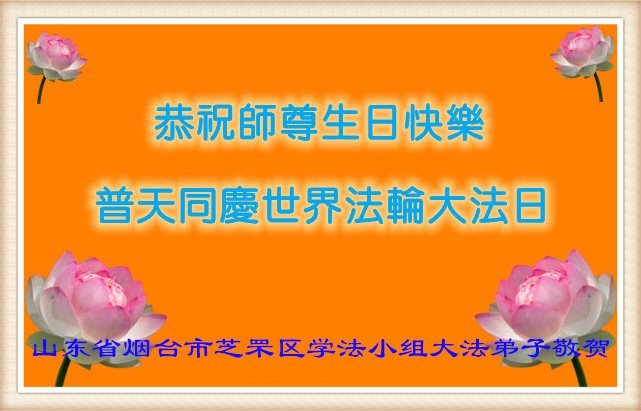 敬贺世界法轮大法日! 恭祝师尊生日快乐! 山东省烟台市芝罘区一学法小组大法弟子敬上 山东省烟台市一学法小组大法弟子恭贺世界法轮大法日暨师尊生日快乐!