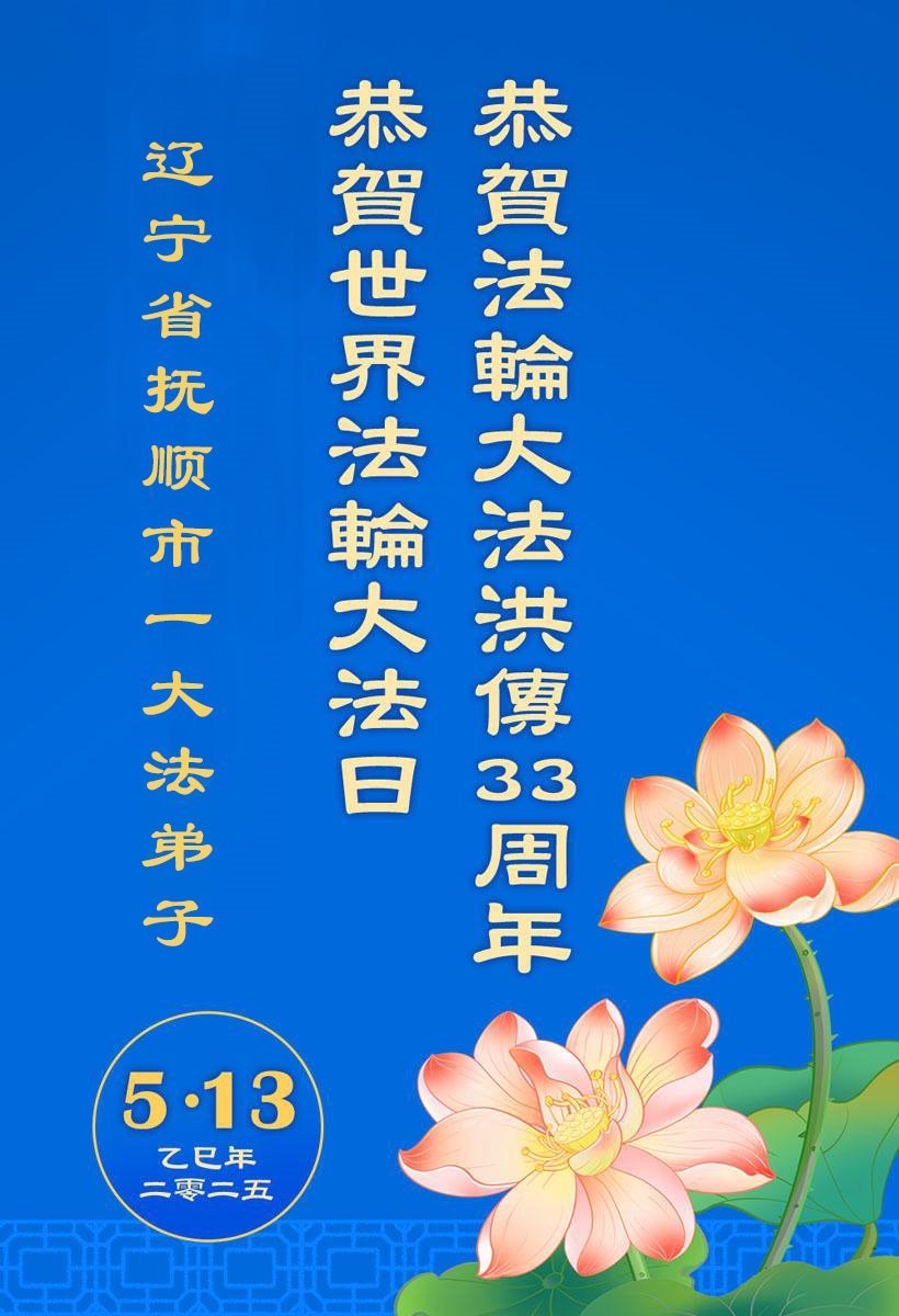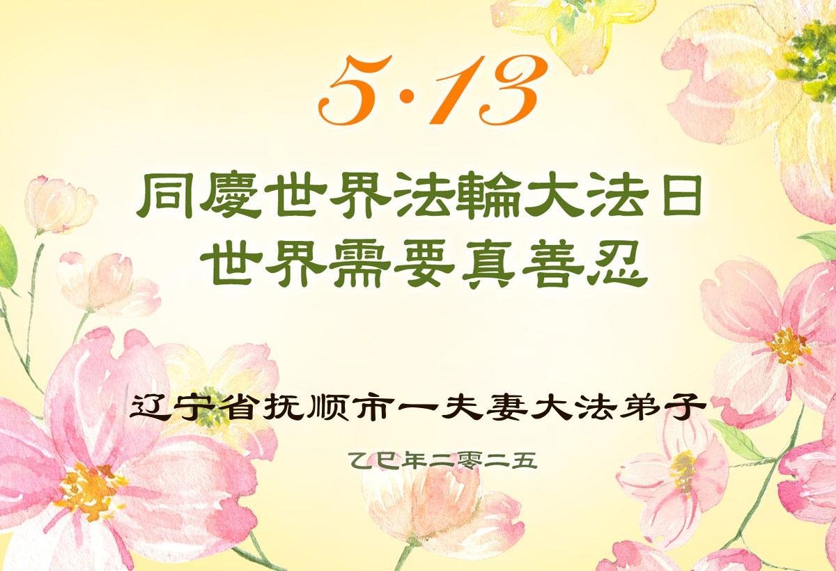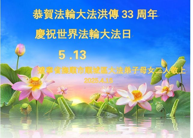 恭贺法轮大法洪传33周年! 庆祝5.13世界法轮大法日! 辽宁省抚顺市顺城区大法弟子母女二人敬上 2025年4月15日 辽宁省抚顺市大法弟子恭贺世界法轮大法日!