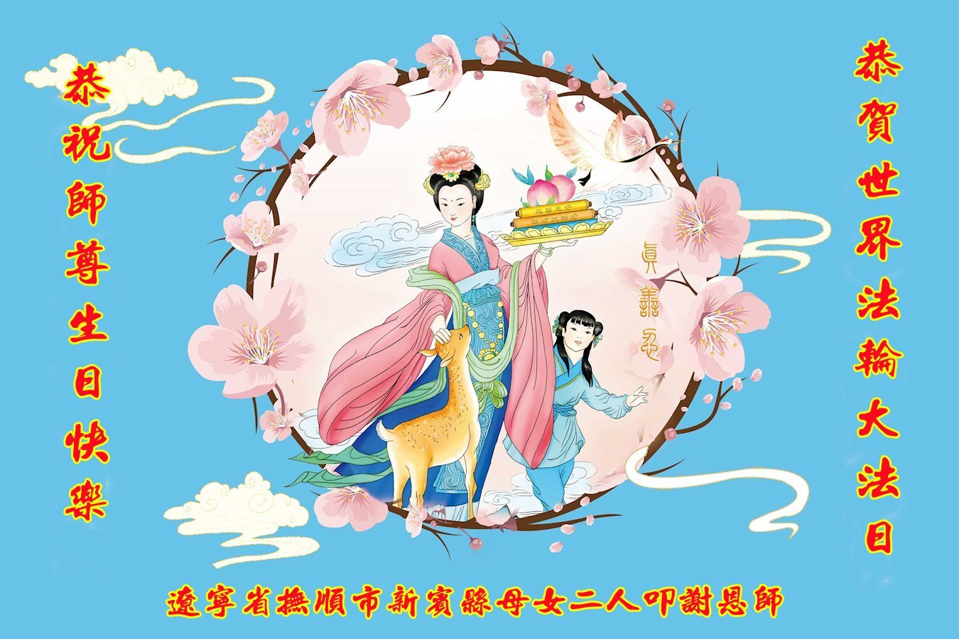 辽宁省抚顺市顺城区大法弟子母女二人恭贺法轮大法洪传33周年!