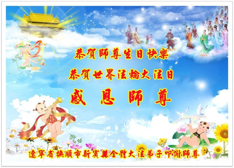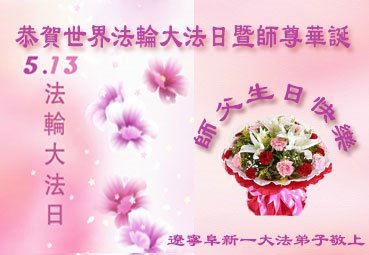 恭贺世界法轮大法日! 恭祝师父生日快乐! 辽宁省抚顺市新宾县大法弟子敬上 辽宁阜新一大法弟子恭贺世界法轮大法日暨师尊华诞!