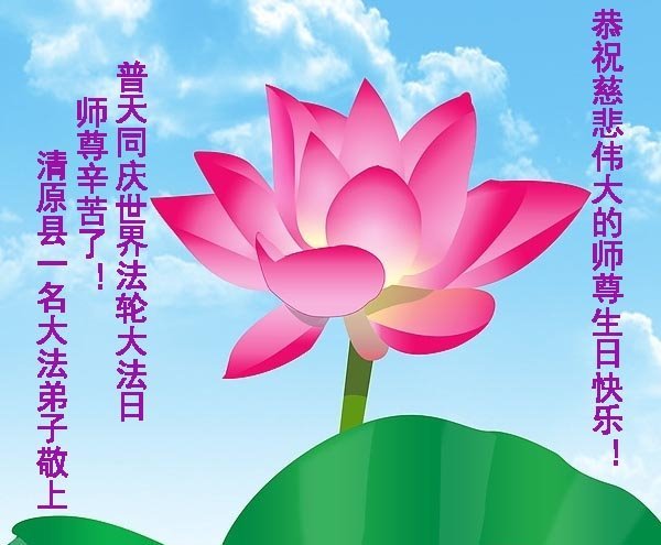 恭贺世界法轮大法日! 恭祝慈悲伟大的师尊生日快乐! 〈思帝乡·贺师尊生日〉 馨香,炼功身健康。兑现誓约修善,渡船航。 屯组广传真相,慈悲救众王。 时刻紧随师父、返仙乡。 清原县一个乡的大法弟子敬上 辽宁省抚顺市清原县一大法弟子恭贺世界法轮大法日暨师尊生日快乐!