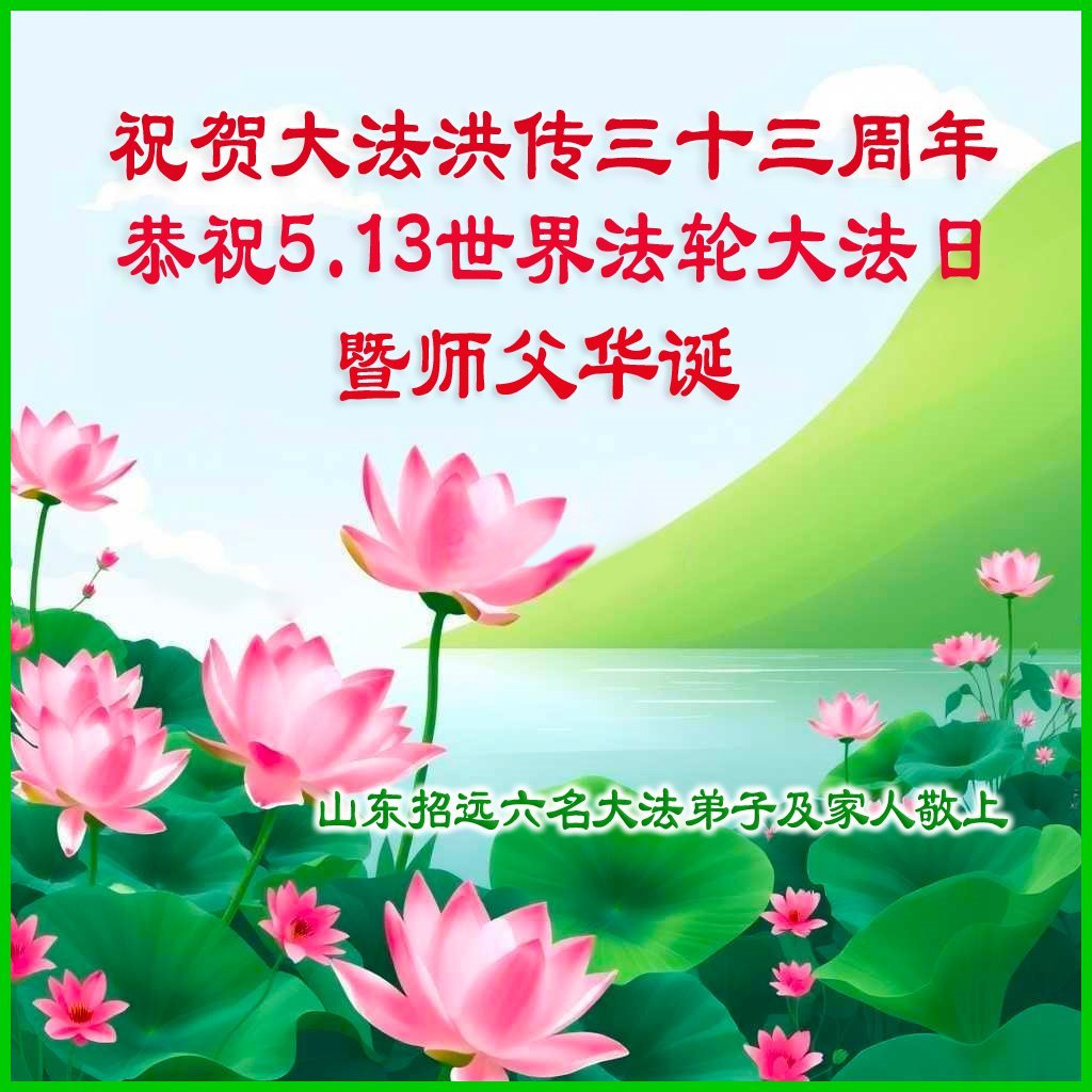 恭贺世界法轮大法日!恭祝师尊生日快乐! 山东省威海市文登区三人学法小组敬上 山东省烟台市招远市六名大法弟子及家人恭祝师父生日快乐!暨世界法轮大法日!