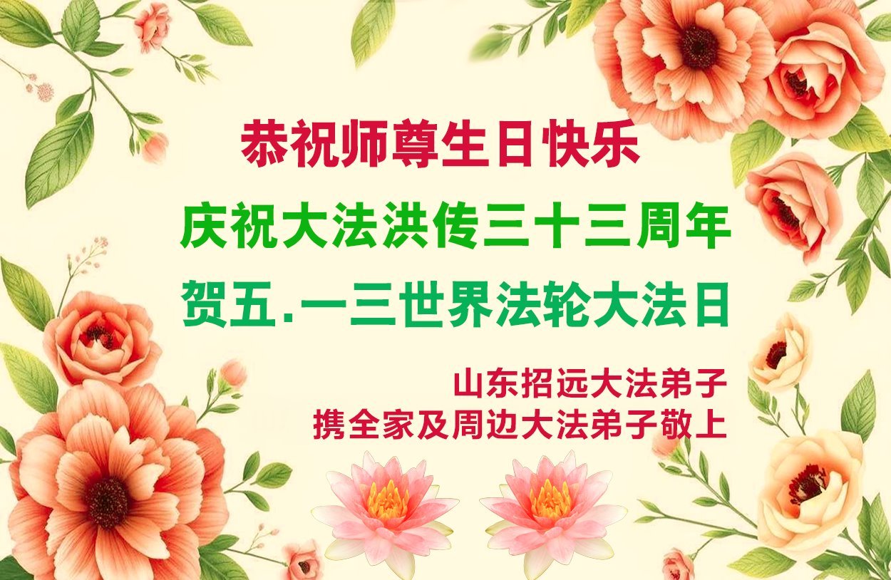 恭贺法轮大法洪传33周年!感恩师尊慈悲苦度! 山东省烟台市芝罘区一大法弟子敬上 山东省烟台市招远市大法弟子姐妹俩恭贺世界法轮大法日暨师父生日快乐!