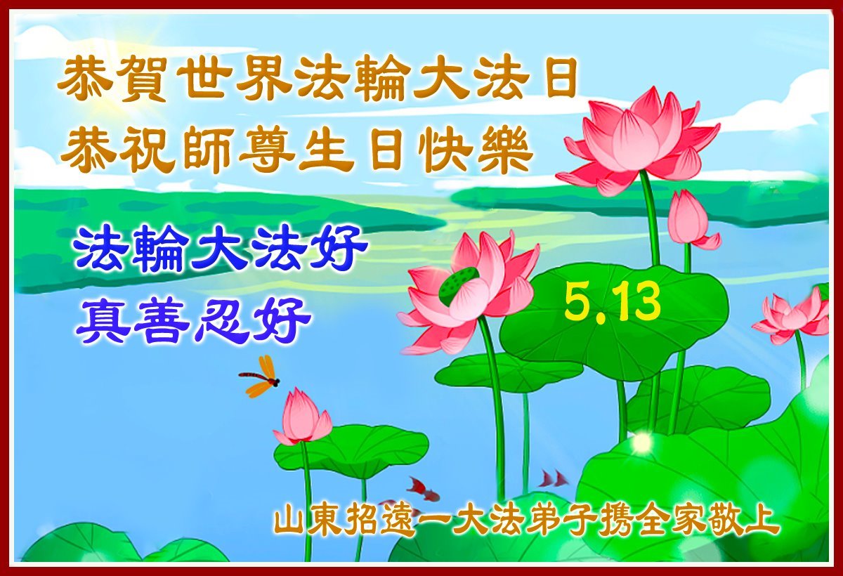 在5.13世界法轮大法日到来之际,恭贺法轮大法洪传三十三周年暨师尊华诞! 感恩慈悲伟大的师尊!师尊您辛苦了!师尊您为救度我们、为成就我们付出了一切!我们今后要用大法严格要求自己,多学法、学好法、同化法,在法上提高。坚定的维护大法!感恩回报师尊的圣恩! 谢谢师尊! 山东省招远一大法弟子携家人敬上 山东省烟台市芝罘区大法弟子恭贺世界法轮大法日!恭祝慈悲伟大的师尊生日快乐!