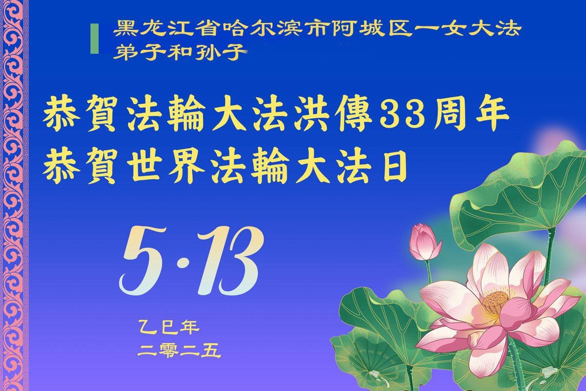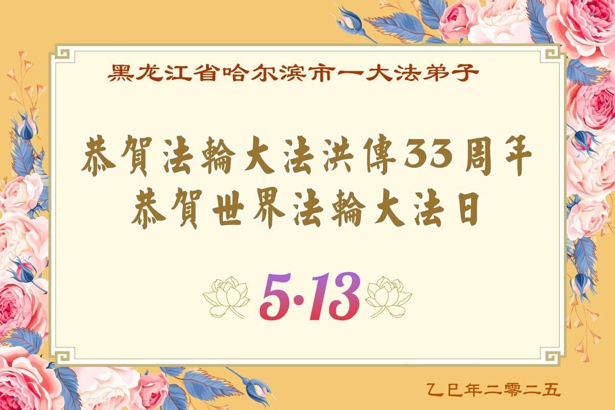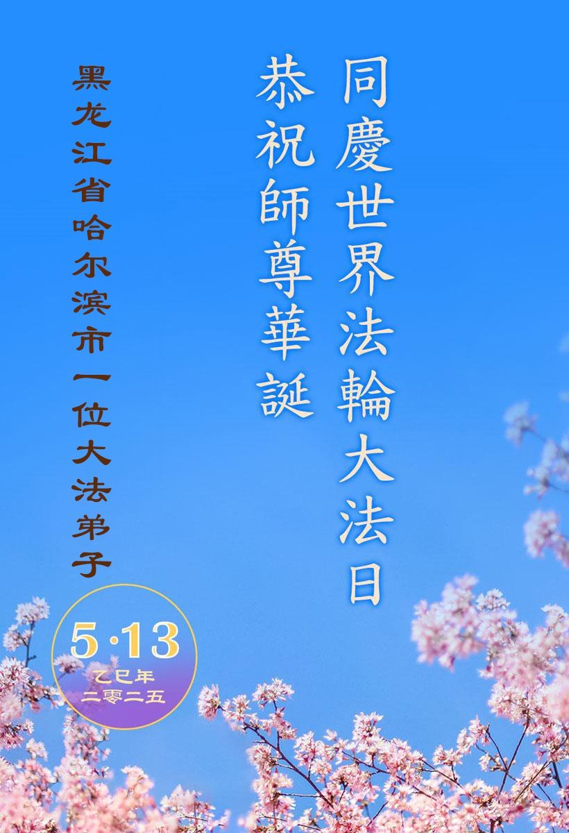 【明慧网二零二五年五月十日】 黑龙江省哈尔滨市一大法弟子恭贺世界法轮大法日暨师尊生日快乐!