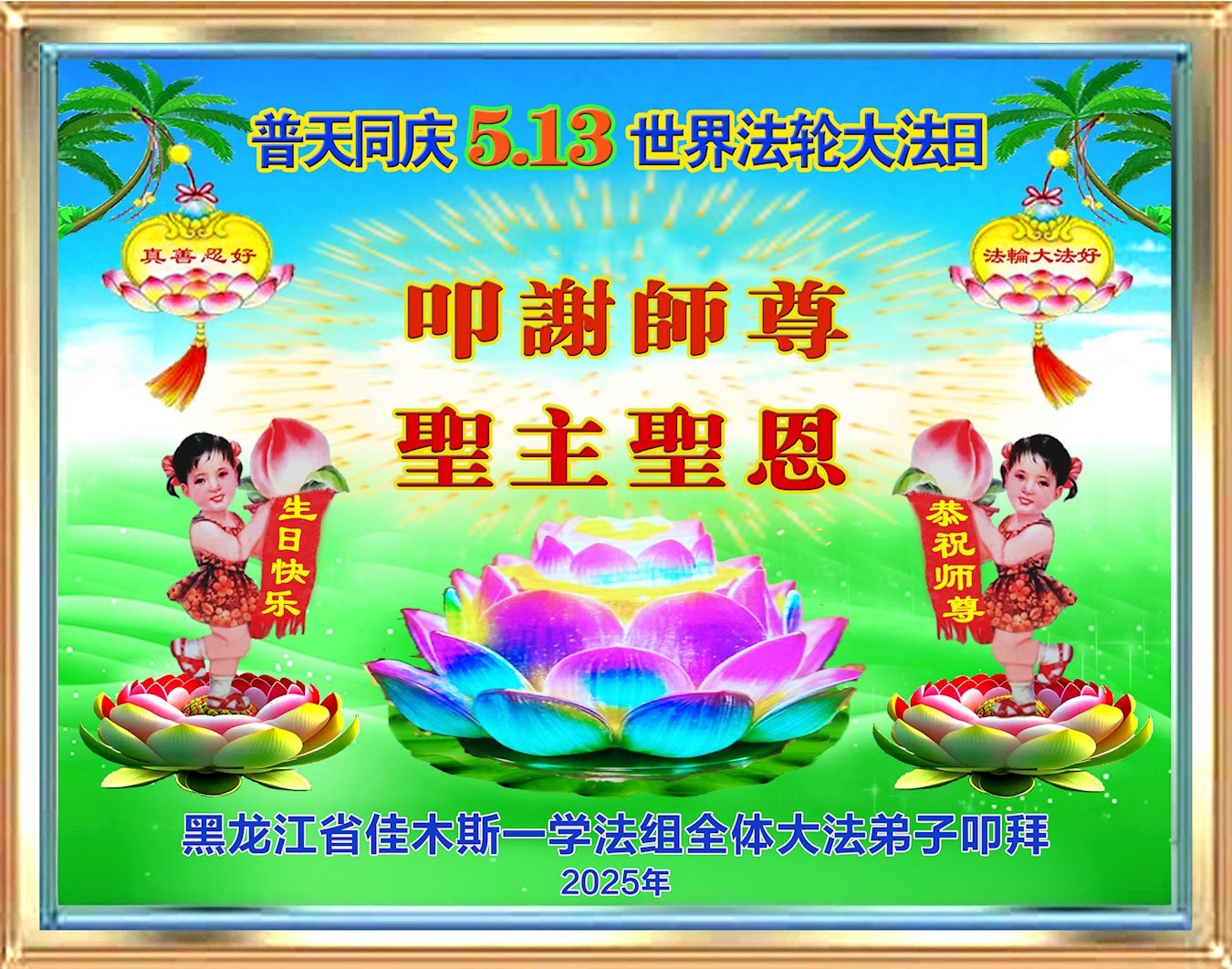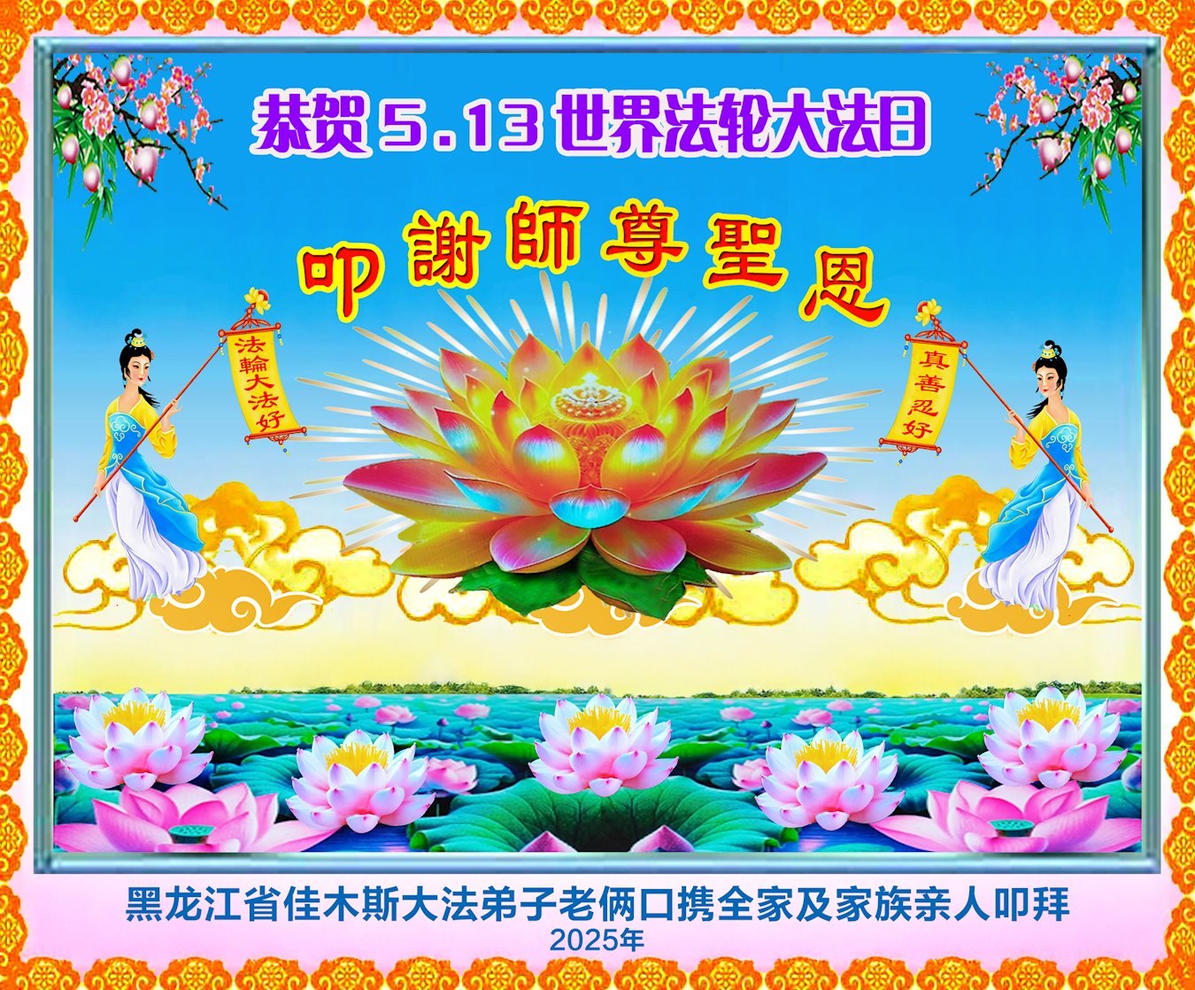 恭贺5.13世界法轮大法日! 恭祝慈悲伟大的师尊生日快乐! 弟子们用千言万语也无法表达对师尊慈悲救度的感恩,师父您辛苦了!弟子唯有精進实修,做好三件事,兑现誓约,圆满随师还。叩拜谢师恩! 黑龙江同江市一农场六位大法弟子敬上 二零二五年四月十九日 黑龙江省佳木斯市大法弟子及家人恭祝师尊华诞!恭贺世界法轮大法日!