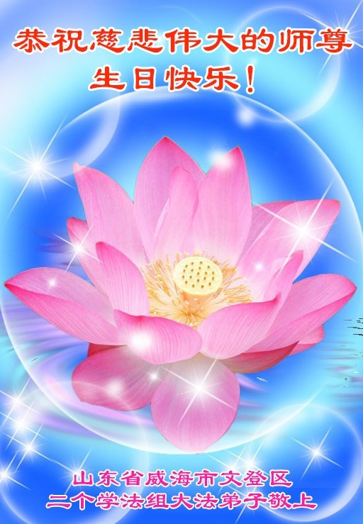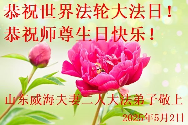恭祝师尊生日快乐! 师父您好:弟子们要做到学法得法,比学比修,共同精進,用心做好三件事,多救人。请师父放心。 山东省威海市文登区二人学法组大法弟子敬上 山东省威海夫妻俩大法弟子恭贺世界法轮大法日!
