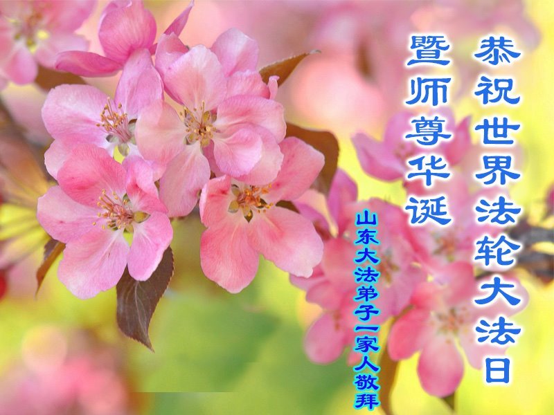 恭贺世界法轮大法日! 恭祝师尊生日快乐! 山东大法弟子一家敬上 山东烟台大法弟子恭贺世界法轮大法日!恭祝师父生日快乐!