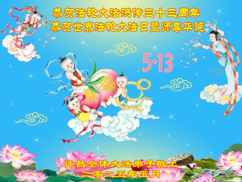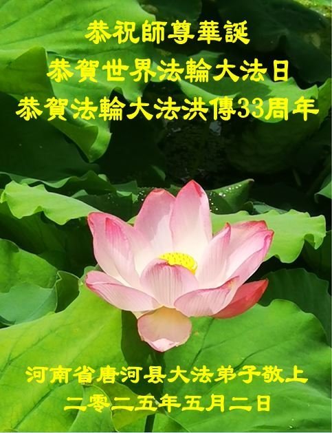 普天同庆世界法轮大法日! 恭祝慈悲伟大的师尊洪传大法三十三周年! 恭祝慈悲伟大的师尊生日快乐! 师尊好!师尊辛苦了!感恩师尊慈悲救度,弟子们一定走好走正最后的路,做好三件事,多救人,兑现誓约,圆满随师还。 金色五月沐佛恩,真修弟子更精進。修炼如初三件事,圆满回天谢师恩。 河南省许昌大法弟子敬上 二零二五年五月一日 河南省南阳市唐河县大法弟子恭贺世界法轮大法日暨恭祝师尊华诞!