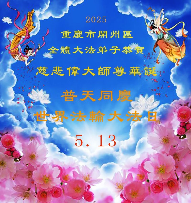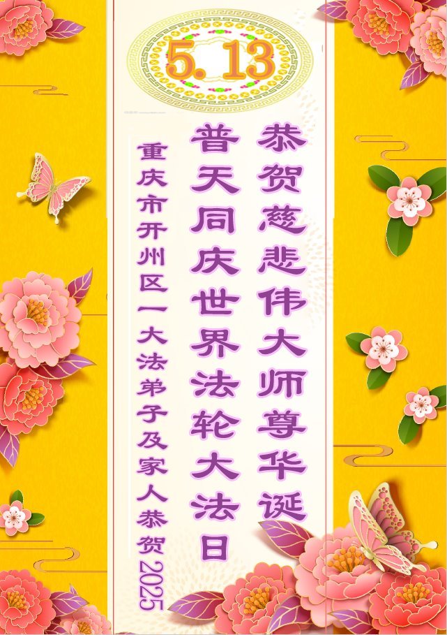 法轮大法好!真善忍好! 重庆市江北五里店一大法弟子全家敬上 二零二五年五月二日 重庆市南岸区全体大法弟子恭贺世界法轮大法日暨敬祝师尊华诞!