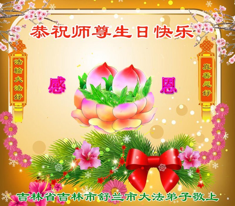 庆贺5.13法轮大法洪传三十三周年暨师父七十四岁华诞! 弟子和家人恭祝师父生日快乐!感恩师父慈悲救度。谢谢师父! 法音传遍天宇佛光照耀十方 法轮大法救度众生出凡尘 真善忍圣言造就新宇佛道神 普天同庆,同祝,同颂 法轮大法好!真善忍好!师父好! 再祝师父生日快乐! 吉林省吉林市舒兰市一大法弟子和家人敬上 2025年5月1日 吉林省吉林市一大法弟子恭贺5.13世界法轮大法日!