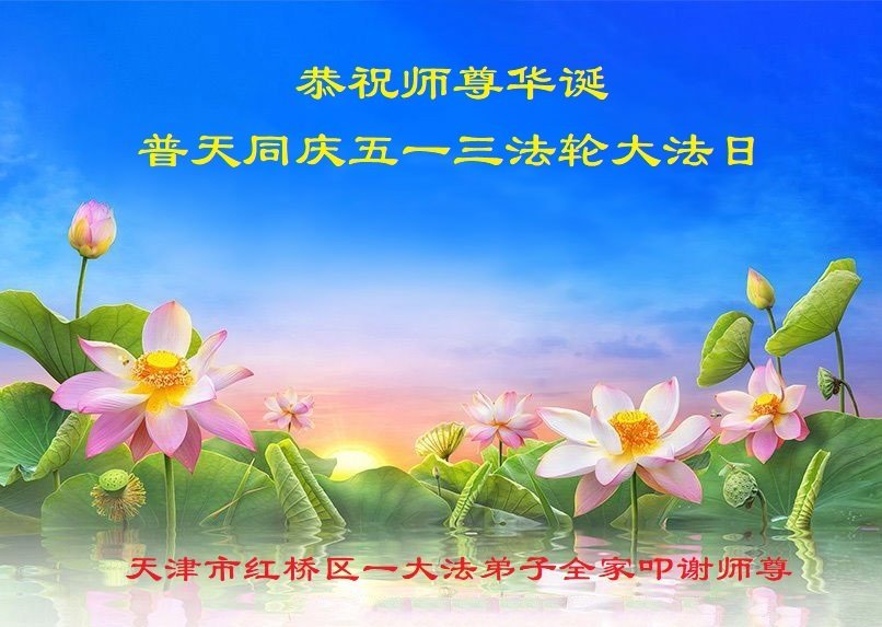 感恩师父慈悲救度,把我从癌症晚期濒临死亡的边缘拯救获得重生,也因此走進大法修炼中。我们全家都万分感恩师父、感恩大法。 借此普天同庆之日,我们全家恭祝慈悲伟大的师父生日快乐!恭贺五一三世界法轮大法日! 天津市北辰区一刚修炼的大法弟子敬上 天津市红桥区大法弟子全家六口恭贺世界法轮大法日!