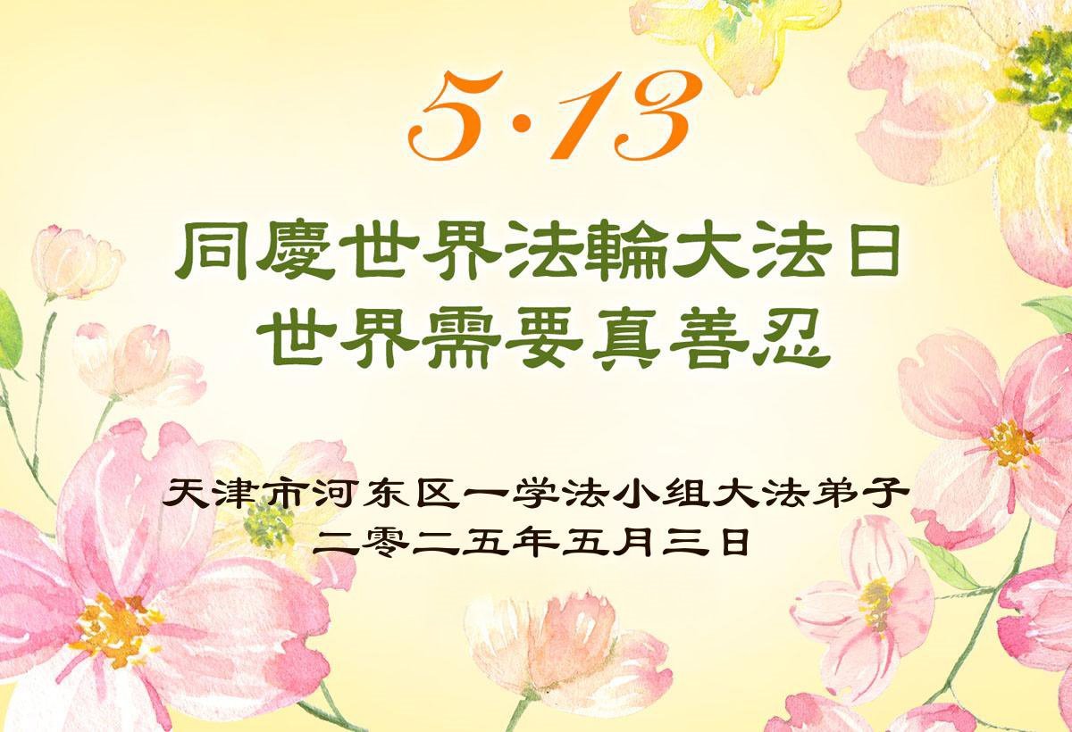 普天同庆5.13世界法轮大法日!恭祝师尊生日快乐! 天津市河东区一学法小组大法弟子敬上 二零二五年五月二日 天津市大法弟子恭贺世界法轮大法日暨师尊生日快乐!