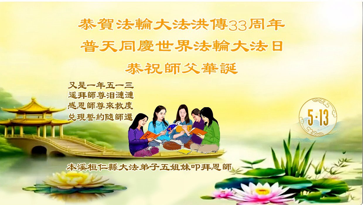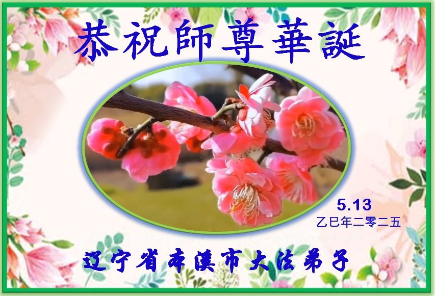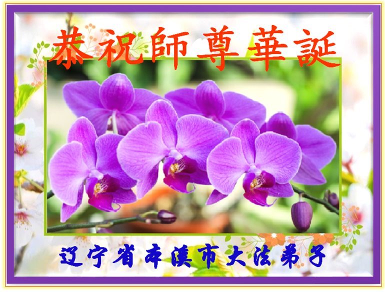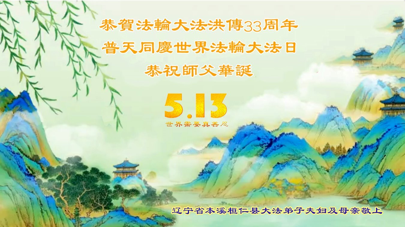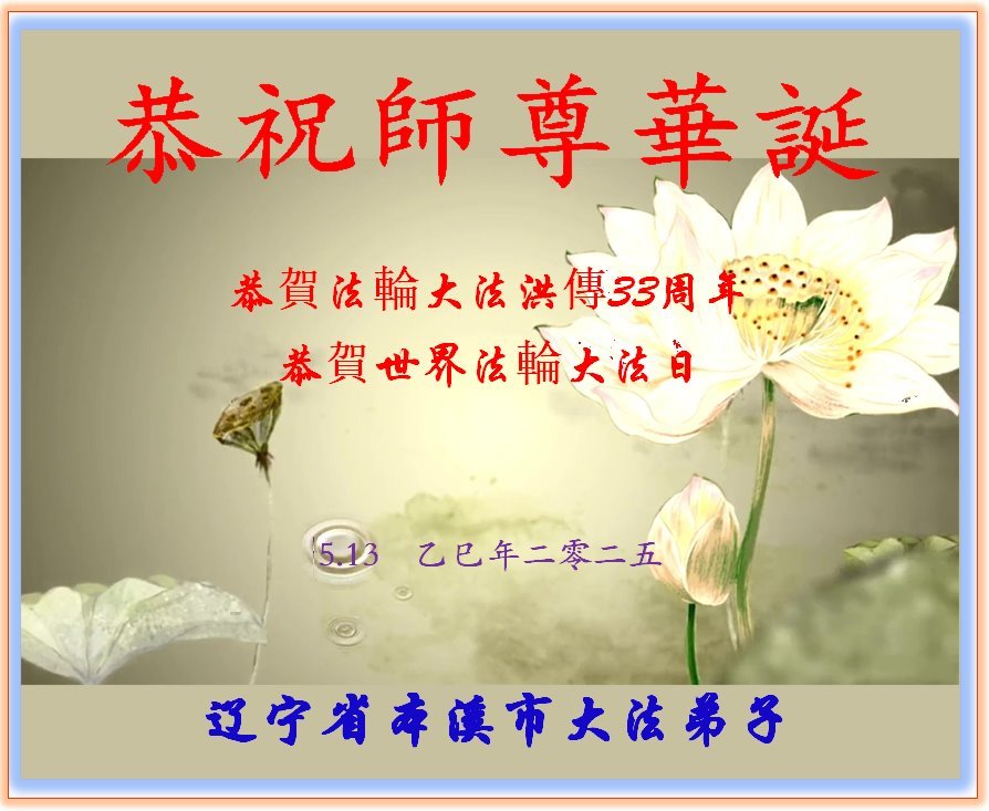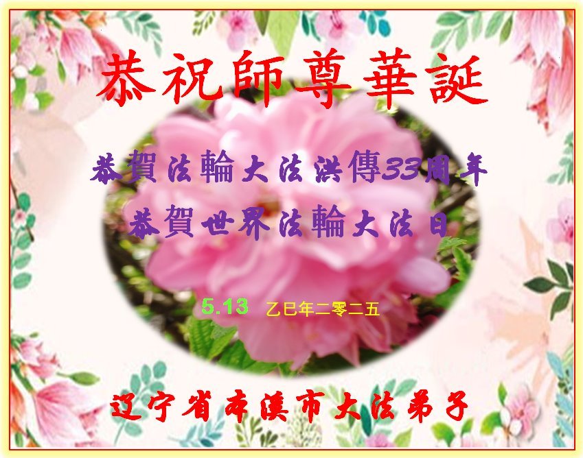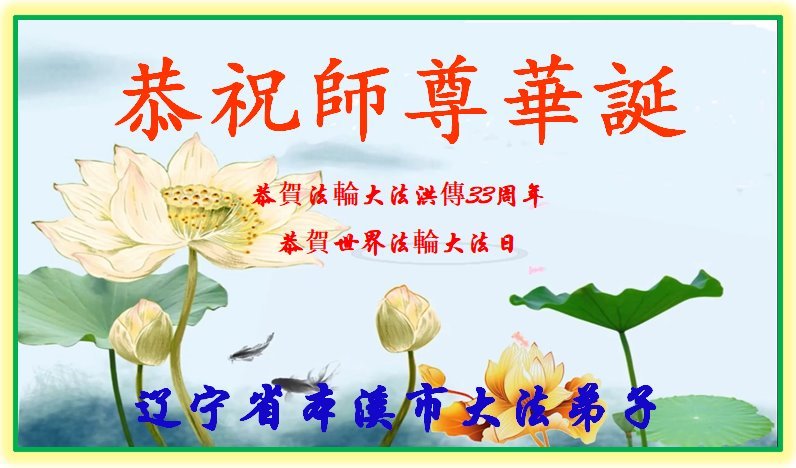 恭祝师尊华诞!庆祝法轮大法洪传33周年!师父您好,恩师辛苦了。 辽宁省本溪市大法弟子敬上 辽宁省本溪市一大法弟子恭贺世界法轮大法日!
