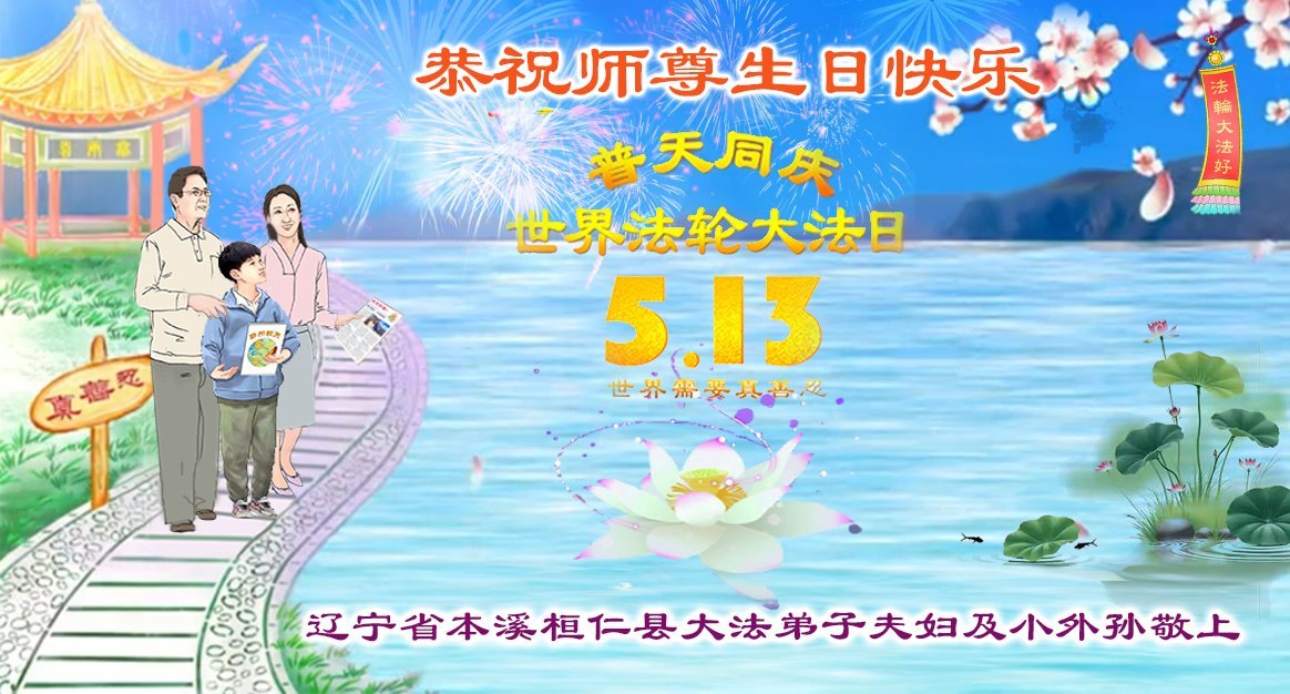 辽宁省本溪桓仁县大法弟子夫妇及小外孙普天同庆世界法轮大法日暨敬祝师尊华诞!