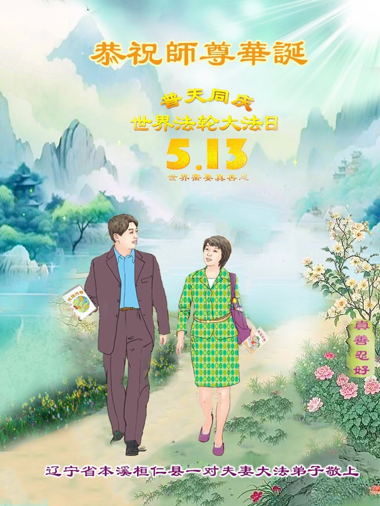 【明慧网二零二五年五月十一日】 辽宁省本溪市夫妻大法弟子恭祝师尊华诞!恭贺世界法轮大法日!