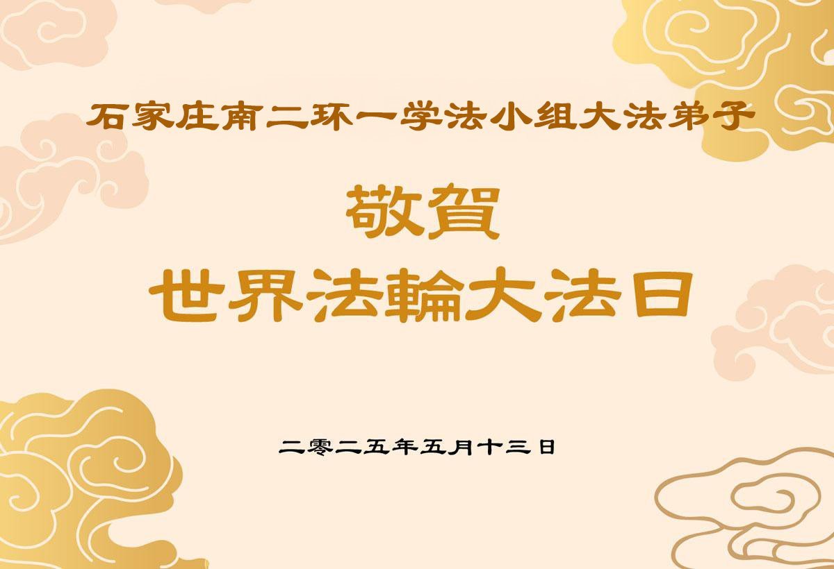 【明慧网二零二五年五月十一日】 河北省石家庄市裕华区一学法小组大法弟子恭贺世界法轮大法日暨敬祝师尊华诞!