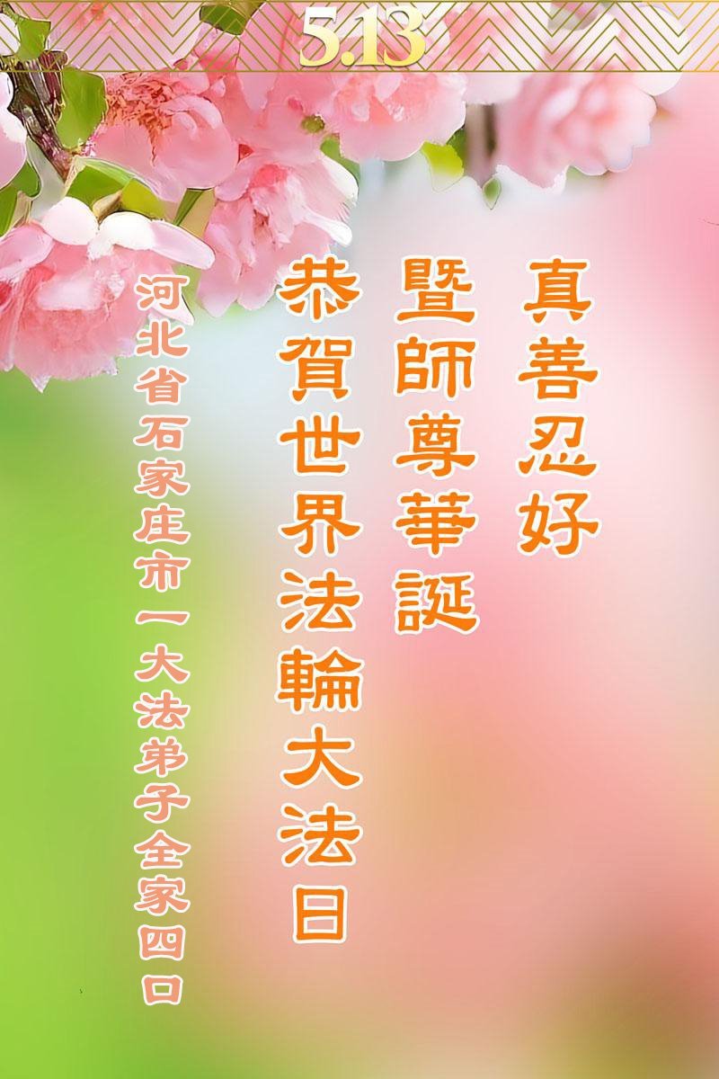 河北省石家庄市一大法弟子全家四口恭贺世界法轮大法日暨敬祝师尊华诞!