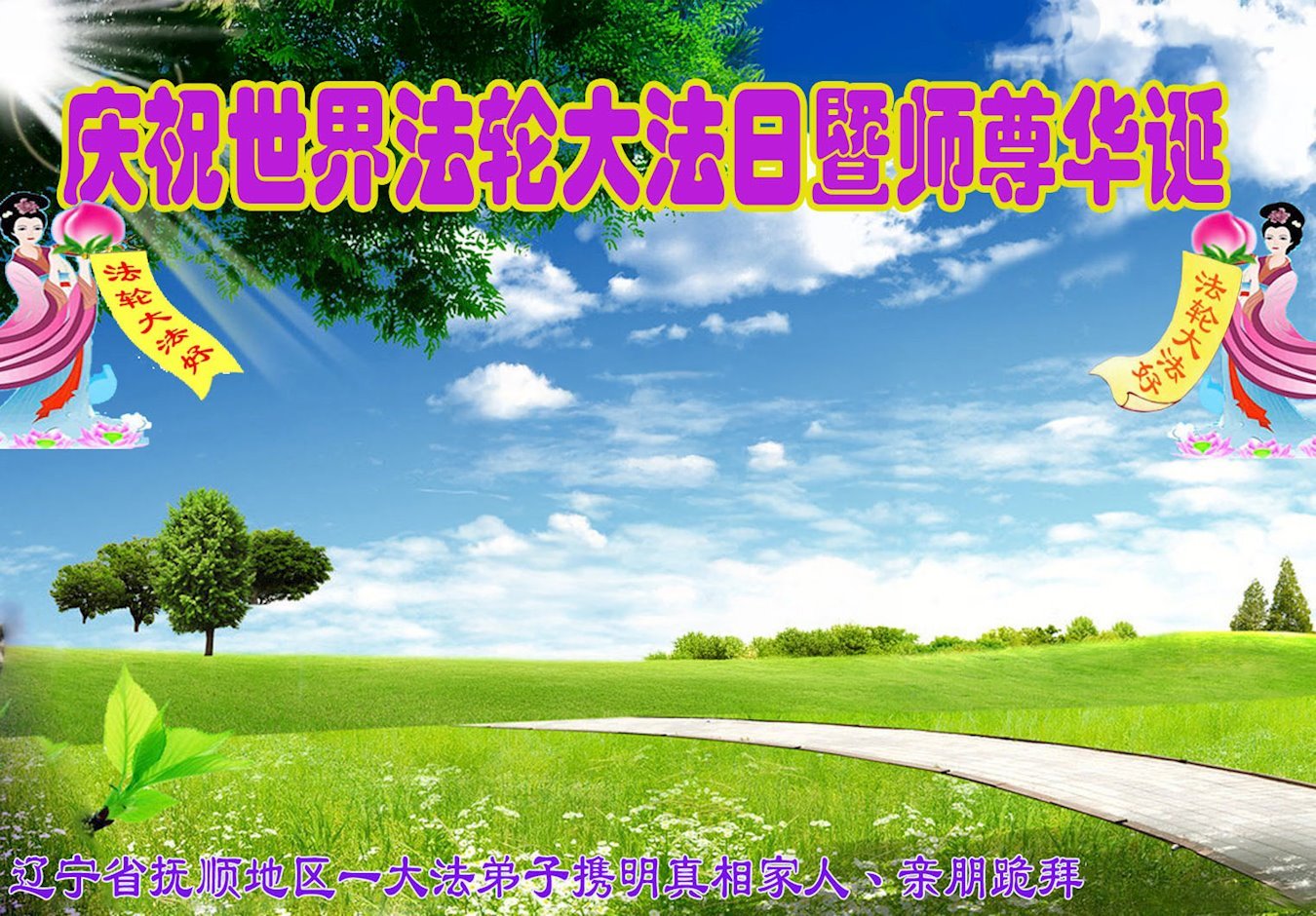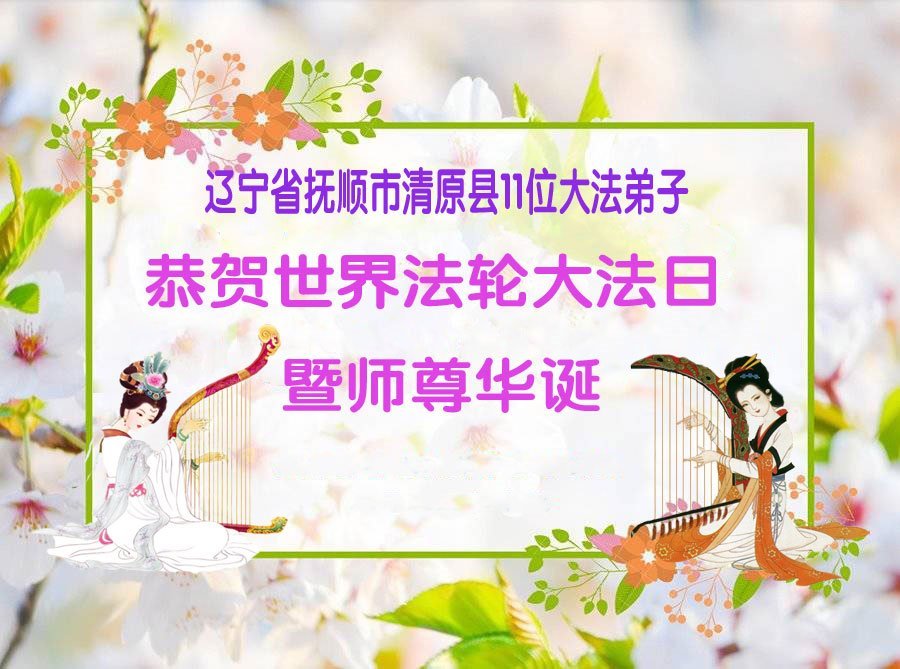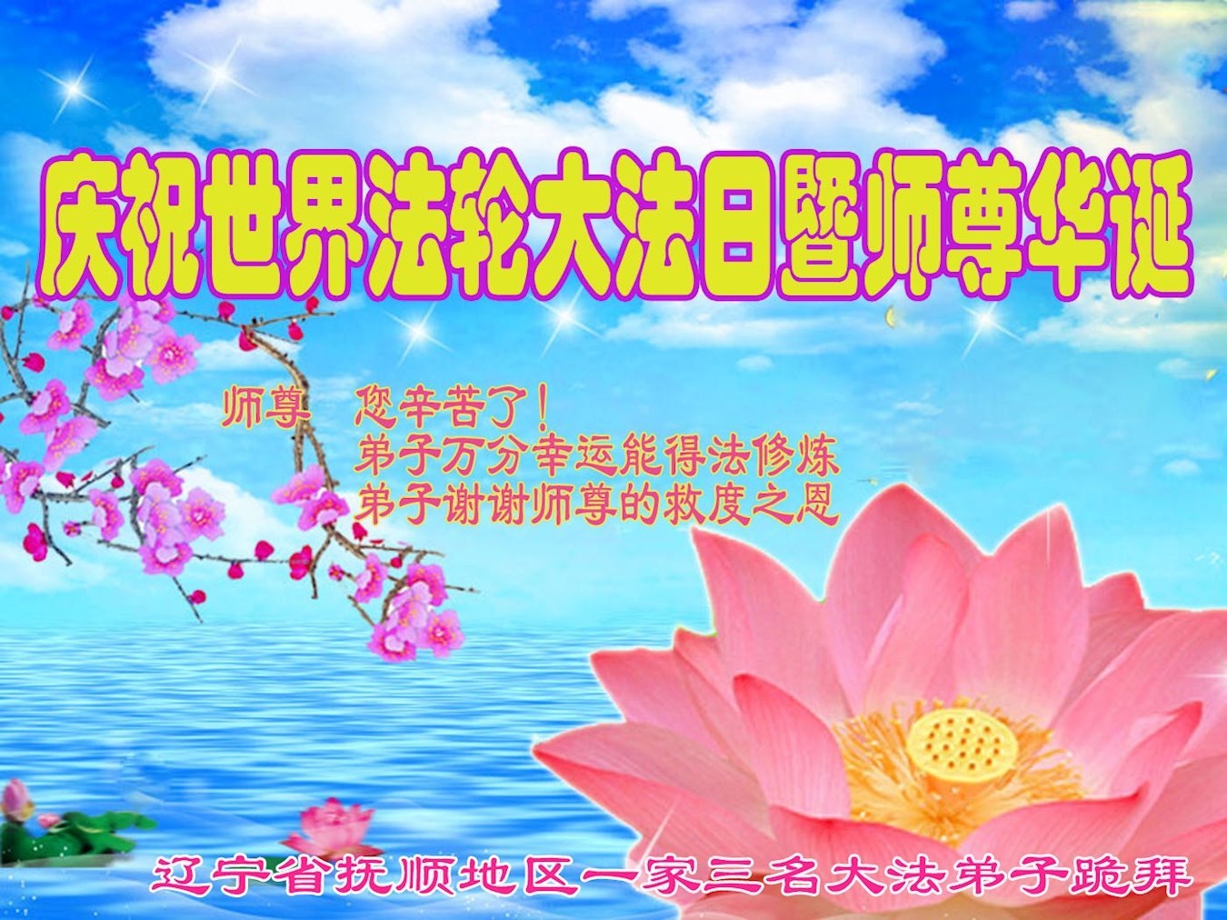 恭贺世界法轮大法日!恭祝师尊生日快乐! 辽宁省抚顺地区二名大法弟子敬上 辽宁省抚顺地区一家三名大法弟子恭贺世界法轮大法日暨师尊生日快乐!