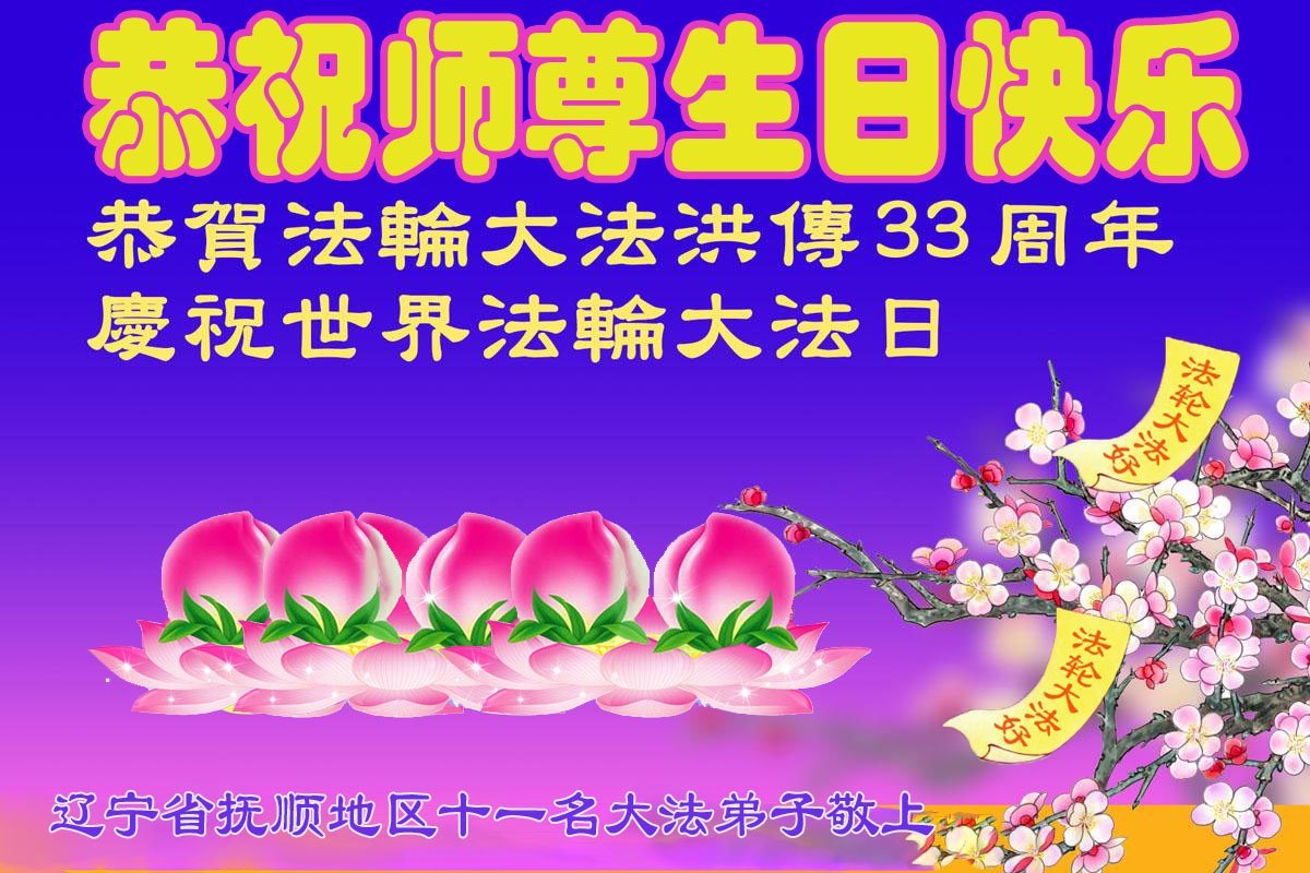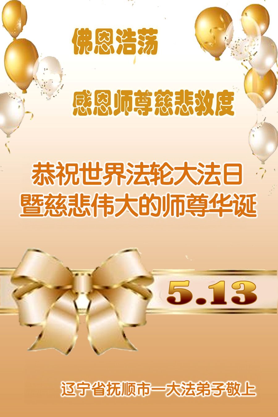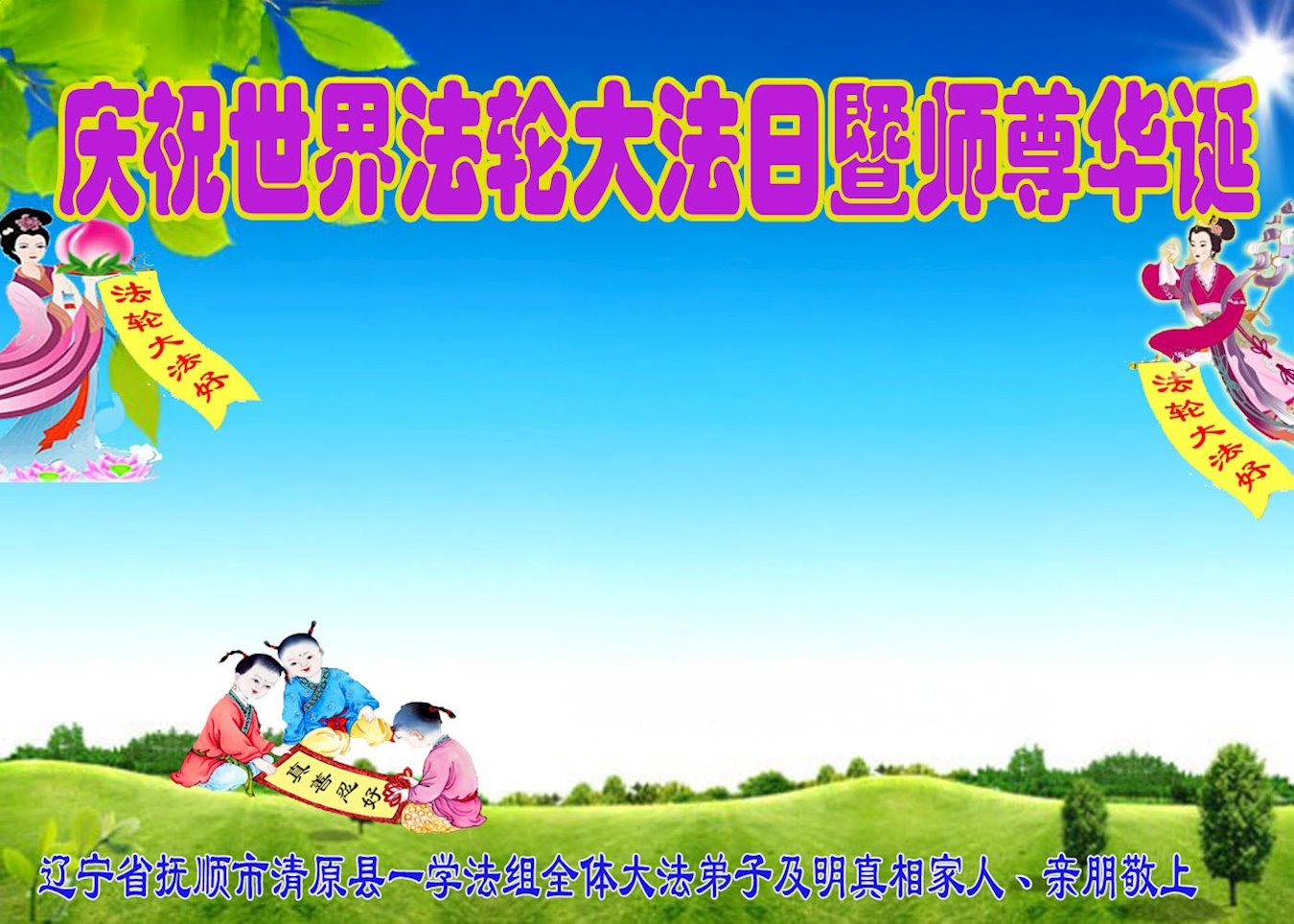 恭贺世界法轮大法日!恭祝师尊生日快乐! 辽宁省抚顺地区二名大法弟子敬上 辽宁省抚顺地区一家三名大法弟子恭贺世界法轮大法日暨师尊生日快乐!