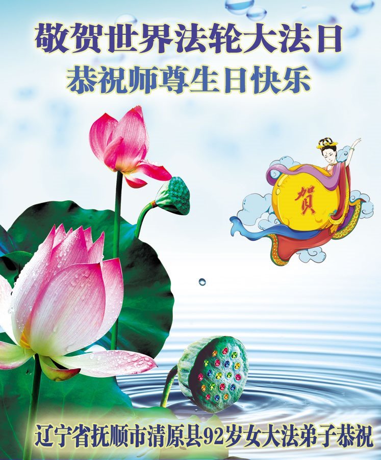 恭贺世界法轮大法日暨师尊生日快乐! 辽宁省抚顺地区一大法弟子敬上 辽宁省抚顺市清原县92岁女大法弟子恭贺世界法轮大法日暨师尊生日快乐!
