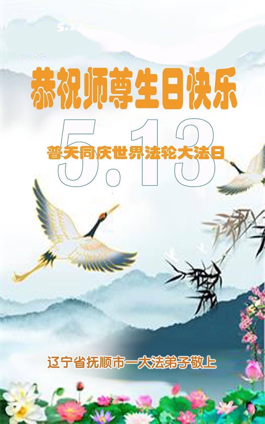 庆贺世界法轮大法日暨师尊华诞! 师尊您辛苦了!弟子万分幸运能得法修炼,弟子谢谢师尊的救度之恩。 辽宁省抚顺地区一家三名大法弟子跪拜 辽宁省抚顺地区一大法弟子恭贺世界法轮大法日暨师尊生日快乐!