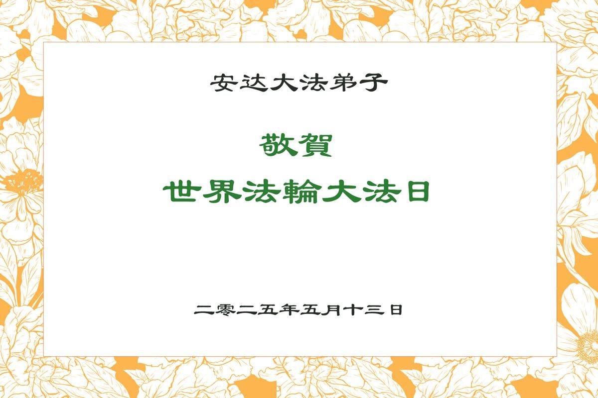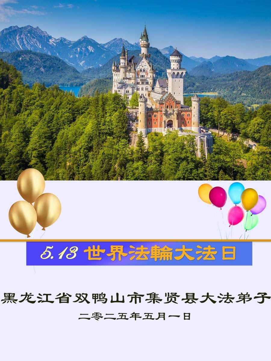 “5.13”是一年一度的世界法轮大法日,在今年的世界法轮大法日来临之际,弟子怀着一颗对师父无比崇敬的心情,给无比伟大的师父送上贺卡。我们都爱“真、善、忍”,受益于“真、善、忍”,同喜同颂“5.13”世界法轮大法日。 我要一如既往的好好修炼,同时让更多的人知道大法的真相,让更多的人受益、得救,这是我们每个大法弟子的愿望,这也是我们必须兑现的誓约,完成自己的使命,跟师父回家。 黑龙江省安达大法弟子敬上 二零二五年五月一日 黑龙江省双鸭山市集贤县大法弟子姐妹恭祝师尊生日快乐!恭贺世界法轮大法日!
