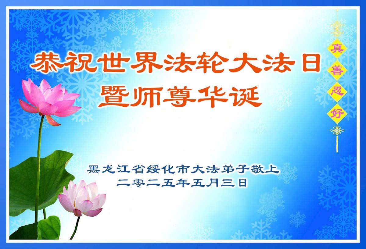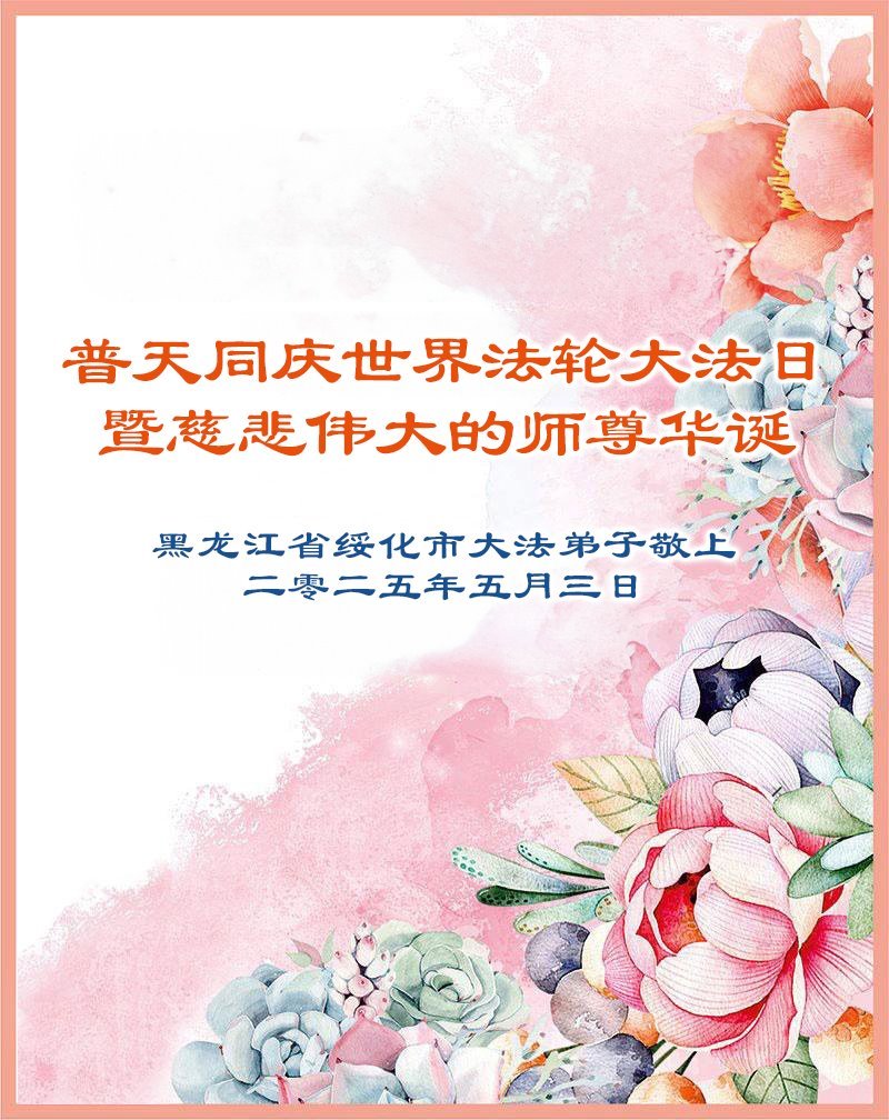 恭贺世界法轮大法日!恭祝慈悲伟大的师父生日快乐!师父辛苦了,谢谢师父的慈悲苦度! 黑龙江省建三江前進农场一大法弟子敬上 二零二五年五月一日 黑龙江省绥化市安达市大法弟子敬贺世界法轮大法日!