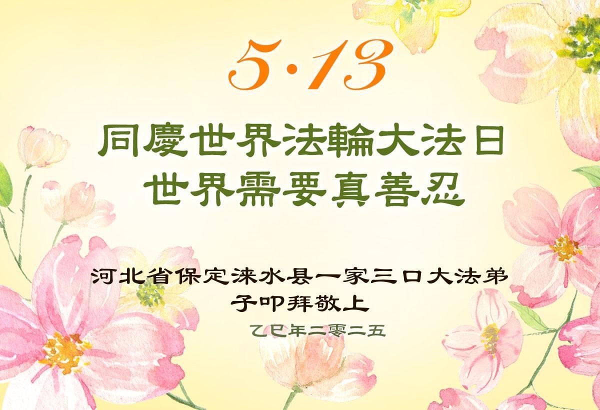 河北省保定涞水县一家三口大法弟子恭贺世界法轮大法日!