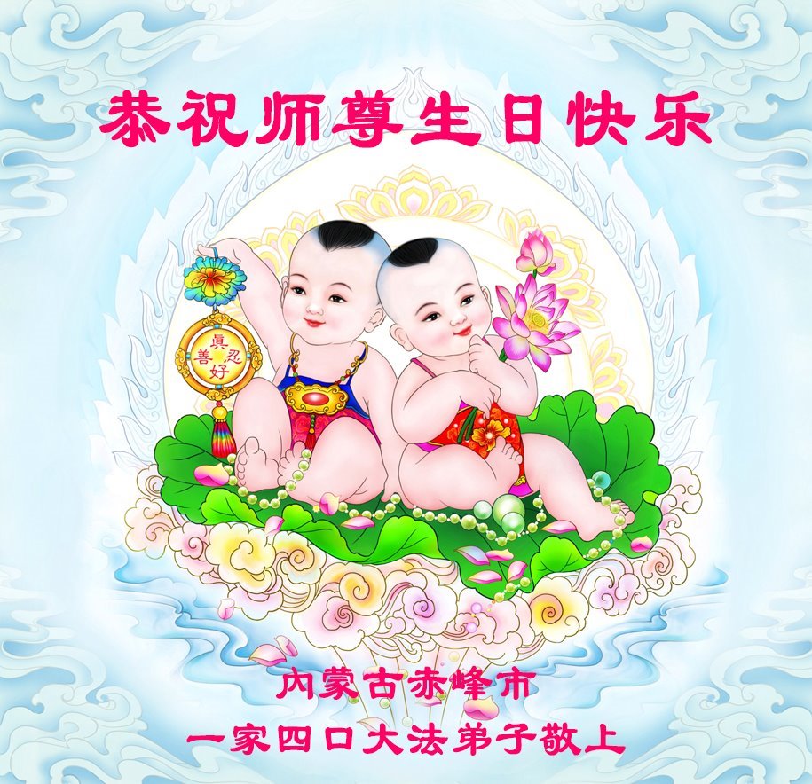 内蒙古赤峰市一大法弟子全家恭贺世界法轮大法日暨慈悲伟大的师父生日快乐!