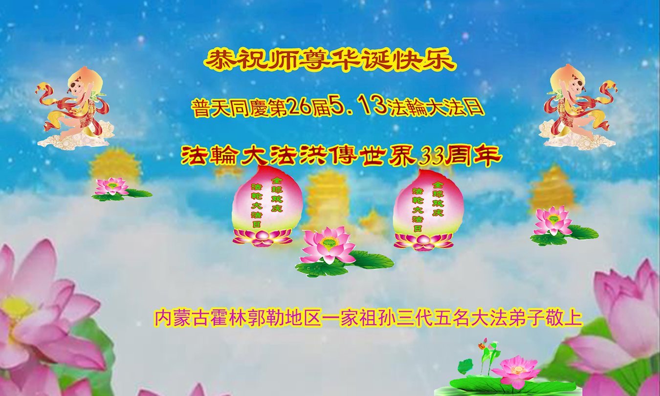 恭贺世界法轮大法日! 恭祝师尊华诞快乐! 内蒙古霍林郭勒地区一家祖孙三代五名大法弟子敬上 内蒙古自治区通辽市霍林郭勒市姐妹两名大法弟子恭贺世界法轮大法日!恭祝师尊华诞快乐!