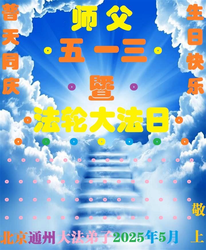 慈悲伟大的师尊好!恭祝师父生日快乐!法轮大法好!真善忍好!恭贺世界法轮大法日! 弟子叩谢师尊的慈悲救度! 北京市通州区大法弟子敬上 二零二五年五月六日 北京市一大法弟子恭贺世界法轮大法日!恭祝慈悲伟大的师尊生日快乐!