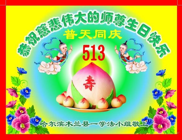 恭祝慈悲伟大的师尊生日快乐!普天同庆513世界法轮大法日! 我们肩负着救度众生的使命,一定听师父的话,学好法,真修多救人。 黑龙江省哈尔滨市大法弟子敬上 黑龙江省哈尔滨市一大法弟子恭贺世界法轮大法日暨慈悲伟大的师尊生日快乐!