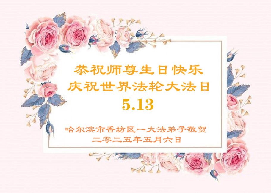 恭祝慈悲伟大的师尊生日快乐!同庆“五一三”世界法轮大法日!感恩师尊对弟子的洪大慈悲与宽容,弟子一定修好自己,多救众生,跟师尊回家。叩拜师尊! 黑龙江哈尔滨市一大法弟子敬上 2025年5月6日 黑龙江省哈尔滨市香坊区一大法弟子恭贺世界法轮大法日暨慈悲伟大的师尊生日快乐!