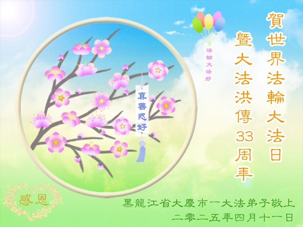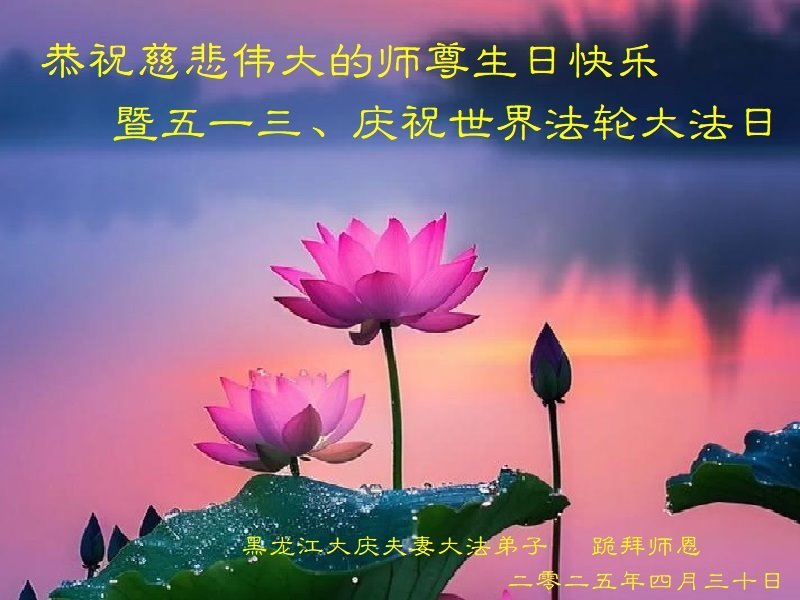 【明慧网二零二五年五月十一日】 黑龙江省大庆夫妻大法弟子恭贺世界法轮大法日暨敬祝师尊生日快乐!